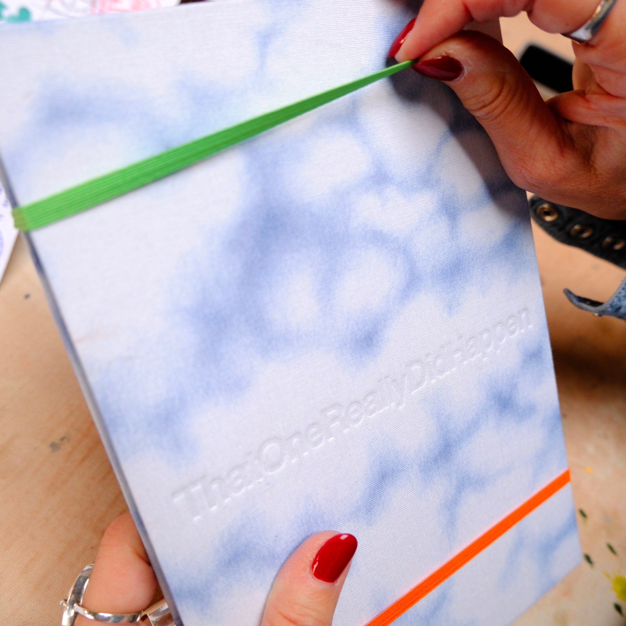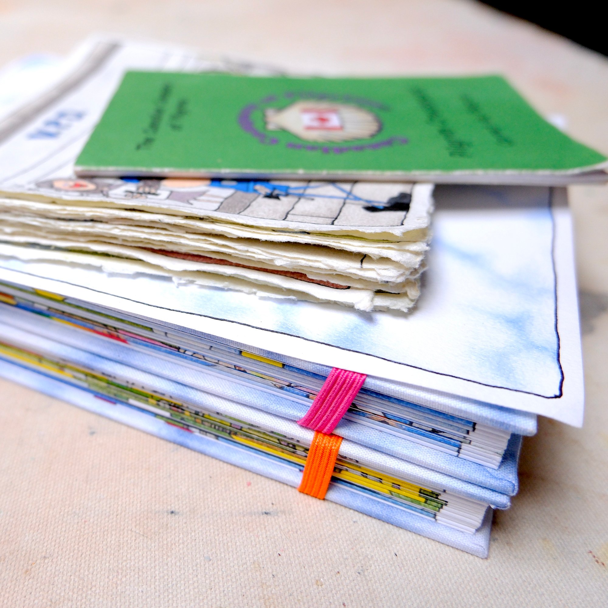 Each copy, printed on heavy weight Mohawk Superfine paper, has a wrapped linen cover and includes two loose illustration prints, individually hand placed and held with photo corners. The books also have two attached elastic ribbons to keep them securely closed.